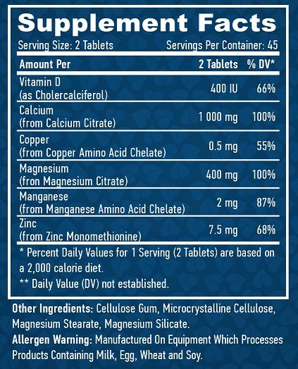 Kaltsium ja magneesium on mineraalid, mis on hea tervise jaoks väga olulised. Need on elutähtsad nii luudele, hammastele kui ka lihaste ja närvisüsteemi tervisele. Soovitatav suhe on 2:1. Tsink, mis on üldise tervise oluline element, on kõigi kehakudede ja sekretsioonide konstruktiivne komponent. Seda leidub suurtes kogustes silma võrkkestas, maksas, neerudes, reproduktiivvedelikes ja meeste eesnäärmes. See mängib tegelikult rolli kõigis biokeemilistes mehhanismides ja füsioloogilistes protsessides. Uuringud näitavad, et tsink on luude tervisele eluliselt tähtis, kuna see on vajalik luude hea tiheduse toetamiseks. Tsingi puuduse üks esimesi sümptomeid on maitse- ja lõhnataju kaotus. Inimese keha ei tooda seda elementi ja seetõttu tuleb see võtta väljastpoolt. D-vitamiin aitab organismil soolestikust kaltsiumi omastada. See konkreetne imendumine on luude tervise jaoks väga oluline ja stimuleerib nende mineraliseerumist. Ilma selle vitamiinita võivad luud muutuda õhukeseks, purunevaks ja pehmeks või kaotada vormi. Lisaks sisaldab see toode betaiini HCl ja glutamiinhappe HCl. Nende ülesanne on toetada kaltsiumi, magneesiumi ja tsingi imendumist maksimaalsel tasemel. See on elulise tähtsusega, kuna soolhappe tase väheneb tavaliselt vanusega. Kasutusjuhend: Üks annus: 2 tabletti Soovitatav kasutamine: võtke üks annus päevas Pakendi suurus: 45