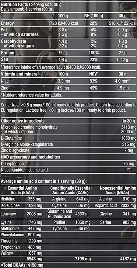* Avaldus viitab veega lahjendatud tarbimisvalmis joogile. Suhkruvaba: <0,5 g / 100 ml tarbimisvalmis joogis. ** See lause viitab veega lahjendatud tarbimisvalmis joogile. Laktoosivaba: <0,1 g laktoosi / 100 ml tarbimisvalmis joogis. *** Gluteenivaba vastavalt Euroopa Liidu õigusaktidele. ANABOOLNE KOMPLEKS Turu üks populaarsemaid isolaate riietus mustaks! Iso Whey Zero Black sisaldab aineid äärmuslikeks vajadusteks, nii et see tehti neile, kes ei saa leppida kompromissidega. Mis on toote keerukus? Kõigepealt peame mainima, et 90% valgusisaldus on meie toodete hulgas suurim! Optimaalne valkude tarbimine on üks lihase ehitamise põhitõdesid, samas kui valk aitab kaasa lihaskoe kasvule. Seda protsessi nimetatakse anabolismiks. Lisaks sisaldab üks portsjon ka 3 grammi kreatiini, mis on üks peamisi komponente füüsilise jõudluse suurendamiseks. Normaalne testosteroonitase on ka meie tulemuslikkuse seisukohalt oluline. Sel põhjusel võib ka tootest leida tsink-bisglütsinaati. Selle tsingi sisaldus aitab säilitada testosterooni normaalset taset veres. Toode sisaldab ka niatsiini või metsikult tuntud vitamiin B3. Niatsiin on NAD (nikotiinamiidadeniindinukleotiid) eelkäija, mis toimib elektronide tarnijana. Niatsiin aitab kaasa ka väsimuse ja kurnatuse vähendamisele. Selgus kompromissideta! Nagu kogu BioTechUSA Iso Whey Zero valgupulber, on ka Black tootesari suhkru-, laktoosi- ja gluteenivaba. Teie suutlikkus algab koostisosadega! NATIVE WHEY tootmine Usume, et peame vastama pidevalt muutuvatele turunõudmistele, pakkudes oma tarbijatele alternatiive, mis vastaksid meie firma väärtustele. Leidsime viisi, kuidas parandada premium-kvaliteeti veelgi, ja nii sündis Iso Whey Zero Native Wheyga. BioTechUSA on pühendunud hoolikalt kontrollitud allikatest pärinevate äärmiselt puhaste toorainete kasutamisele - seetõttu valisime Native Whey Isolate. Native Whey Isolate on eriline erakordse puhtusega vadakuvalk, mis tänu pidevale arendamisele on kasutusel mitmes meie tootes. Sellised tooted on laktoosi-, gluteeni-, ja suhkruvaba Iso Whey Zero* ja katmata Zero Bar, mis on samuti laktoosi-, gluteenivaba ja ei sisalda lisatud suhkrut. BioTechUSA. Sihi kõrgemale! Kõik algab vundamendist, seetõttu on BioTechUSAle äärmiselt tähtis, et Native Whey Isolate tootmisel kasutatav piim pärineks ainult vabapidamisel rohusöödal olevatest lehmadest. Toormaterjali kvaliteet on sinu sooritusvõime seisukohast võtmetähtsusega! Native Whey on premium-valgu põhikoostisosa. See pärineb eranditult vabapidamisel olevatelt rohusöödal toidetud lehmadelt lüpstud toorpiimast*. See on antibiootikumi- ja sünteetiliste hormoonide (rBST) vaba. Tänu erilisele tootmisprotsessile säilib Native Whey Isolate valgu struktuur täielikumalt. *Toorpiim on kõigi mikroorganismide kõrvaldamiseks pastöriseeritud. Soovitame Iso Whey Zero Black-i