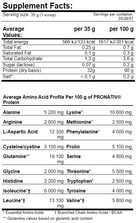 Amix ZeroPro Protein is the cleanest, most advanced whey protein isolate (WPI) available. It is typically low lactose. Amix ZeroPro Protein is engineered for performance. A clinical study taking Pronativ resulted in improvements in muscle power, recovery time, performance, and muscle adaptations. Typically whey proteins are a derivative of cheese production and are extracted utilizing two, high temperature pasteurization steps. For Pronativ has developed a new innovative technology allowing for the extraction of native whey protein directly from milk using low temperature micro and ultrafiltration. Pronativ is naturally rich in essential amino acids that cannot be synthetized by the body, including 15 % more leucine than in a traditional WPI. Pronativ is better absorbed by the intestine and made more available to muscle tissue whey compared to a traditional WPI. Benefits: