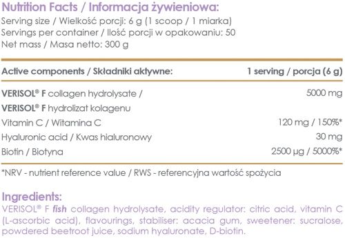 Collarose Fish are the ideal supplements for women whose skin is exposed to excessive sunlight, people who spend a lot of time in front of the computer or telephone screen, and all those whose diet does not provide them with all the ingredients necessary for healthy and youthful-looking skin. The products are especially recommended for women who look after their appearance and wish to slow down the skin ageing process and improve skin firmness, tone and elasticity. Fish collagen is nearly identical to our own collagen. It contains high concentrations of glycine, proline and hydroxyproline, which are amino acids - compounds that build our body. The formula, which supplements the diet with collagen obtained from fish and enriched with hyaluronic acid, vitamin C and biotin, ensures a beautiful appearance, slows down the ageing of the skin and improves its firmness, tone and elasticity. A product specially formulated for women with an intolerance to beef or pork protein. Collarose Fish offers guaranteed synergy and positive effects of several elasticity-enhancing ingredients, which significantly increases the effectiveness of the product. Collarose Fish contains patented VERISOL collagen peptides produced by German pharmaceutical company GELITA, which boost collagen production from the inside by creating new collagen fibres in the whole skin and especially in the face. What is collagen? Collagen is a form of protein that is the main glue that binds the cells of our skin and makes up to 80% of its dry weight. Collagen makes our skin firm and smooth. Collagen deficits are most noticeable on the face and neck, where wrinkles and imperfections appear. The skin then droops and sags as it loses elasticity with the loss of collagen. Bioactive collagen peptides found in VERISOL, even on their own, are a powerful tool to fight the ageing process of the skin and accelerate its regeneration. The effects of Collarose are reinforced by other active ingredients such as: Vitamin C, Biotin, Hyaluronic acid. Collarose offers guaranteed synergy and positive effects of several elasticity-enhancing ingredients, which significantly increases the effectiveness of the product. Vitamin C Only with sufficient vitamin C levels is the body able to produce collagen efficiently and effectively. In addition, vitamin C has a great impact on the final shape, correct and strong structure of collagen fibres and has strong antioxidant properties. Biotin Biotin is also known as vitamin H or vitamin B7. It is also called the VITAMIN OF YOUTH. It gives us more energy, regulates our mood and facilitates the absorption of vitamin C. It is an exceptional B-group vitamin, which has a beneficial effect on the quality of our life and health. Although biotin has many different functions, without a doubt its most popular effect is on the condition of the hair, skin and nails. Hyaluronic acid Hyaluronic acid is an organic compound that is present in every living organism. It has hygroscopic properties, i.e. it binds water in the dermis. One molecule of hyaluronic acid is able to bind up to 250 water molecules. As we age, the amount of hyaluronic acid begins to drop, so it loses its ability to bind water and the first wrinkles appear.