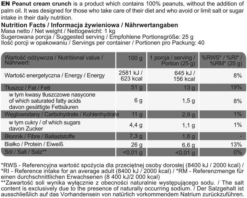 100% Peanut Butter is a natural nut cream made from peanuts from environmentally friendly farms. No sugar, hardeners, salt or other unnecessary additives are added, making it a source of healthy fats and protein. Peanuts found in our cream are a valuable source of unsaturated fatty acids that contribute to lowering blood cholesterol levels and lowering the risk of atherosclerosis and cardiovascular diseases. 100% Peanut Butter will find a wide range of applications in your kitchen, as it is suitable for spreading on bread, baking, it can be used as an addition to your morning oatmeal, homemade desserts and cakes, and even as an ingredient of various savoury dishes. Take care of your health and add AllNutrition Peanut Cream to your daily diet.