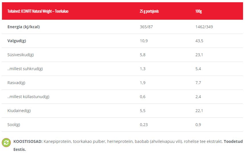 ICONFIT Natural Weight on Eestis toodetud supertoitude segu, et olla toeks tervisliku kaalulangetamise teekonnal ja figuuri hoidmisel. Selles on rikkalikult proteiini ja kiudaineid ning rasvapõletust toetav imeline rohelise tee ekstrakt. Looduslik taimne koostis on vitamiinirikas, kergesti seeditav ja aitab hästi kõhtu täis hoida.